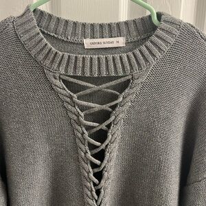 This medium gray crewneck sweater features a striking V-shaped lace-up detail on the front, adding a unique touch to its classic design. Made from a comfortable knit fabric, it offers a relaxed fit perfect for casual wear. The ribbed neckline and likely matching cuffs and hem complete the look, ensuring both style and comfort.