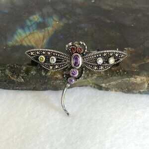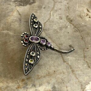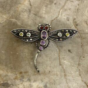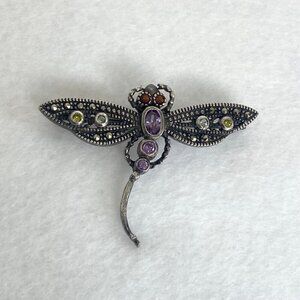 Oxidized Sterling Silver 925 Marcasite & Multi Color CZ Dragonfly Insect Brooch