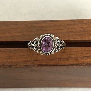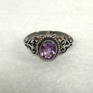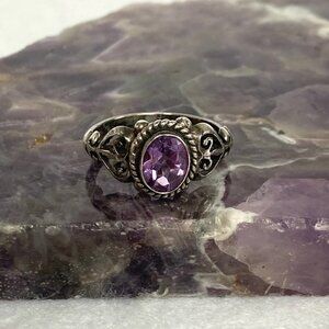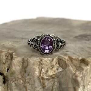 Oxidized Sterling Silver 925 Oval Amethyst Scrollwork Openwork Ring Size 6.75