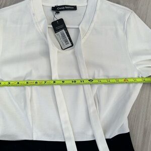 Timeless Elegance in Black & White! This Oxiuly Fashion dress is a must-have for your wardrobe! With a sophisticated contrast design, a flattering A-line silhouette, and an elegant bow-tie neckline, this dress is perfect for office wear, dinner dates, or any classy occasion.