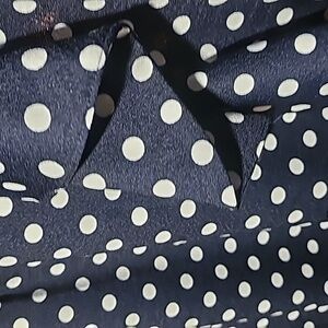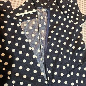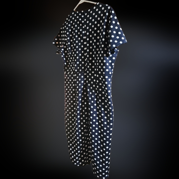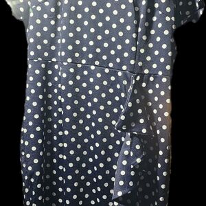 Oxiuly Fashion XL form fitting dark NAVY & WHITE polka dot dress with falbaba fold accent on front. There is a small run near the right front sleeve and is shown in picture. The length is 42" and the back zipper is 15". Have fun with this polyester/cotton blend dress whether at work or to say HELLO, WHAT'S UP? - with the right accessories it's fabulous!
