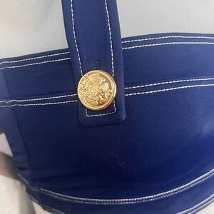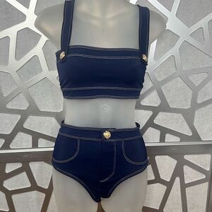 Deep navy blue with white contrast stitching, giving it a stylish, structured look. Bandeau style with thick straps featuring decorative gold-tone buttons for a unique, nautical-inspired appearance. High-waisted with a flattering cut and faux pocket detailing, also adorned with a gold-tone button at the waist.