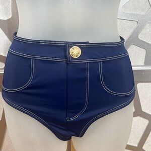 Deep navy blue with white contrast stitching, giving it a stylish, structured look. Bandeau style with thick straps featuring decorative gold-tone buttons for a unique, nautical-inspired appearance. High-waisted with a flattering cut and faux pocket detailing, also adorned with a gold-tone button at the waist.