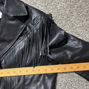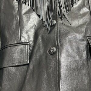 The jacket offers a chic western-inspired look with its fringe design and sleek black faux leather finish, making it a stylish outerwear choice.