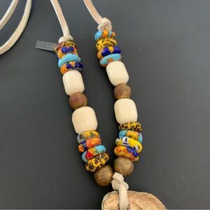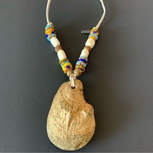 Trade bead painted oyster shell pendant necklaces on suede leather cord with an adjustable length.