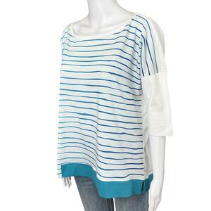 A wavy stripe in two ocean hues adds a breath of fresh air to any look. Relaxed and easy pure cotton top in a roomy silhouette. Pullover with scoop neck, drop shoulders, elbow sleeves and colorblock inset at hem.