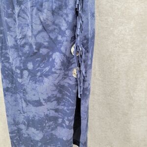 Maxi skirt has slit with fabric fringe and concho details from slit to waist. Belt loops.