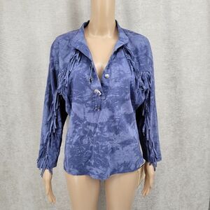 Top has dolman style sleeves with fringe down the arms, concho details on button placket, and a mandarin high collar.