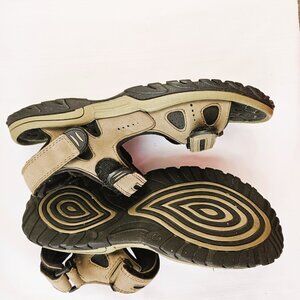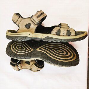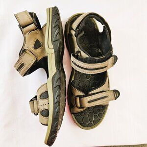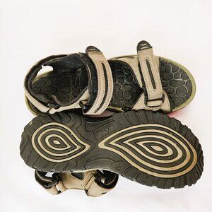 These open toe strappy Ozark Trail Hobbs V Sport Hiking Water Sandals will heighten your outdoor sports activity enjoyment. They feature an open toe, three pull apart closures for easy on and off, Built in cushion foot bed with insole traction, Deep bottom sole traction for safety, Made of a breathable quick drying material and has several drainage openings when engaging in water activities Size 10. Preowned. Shows minimal signs of wear. Very Good Condition.