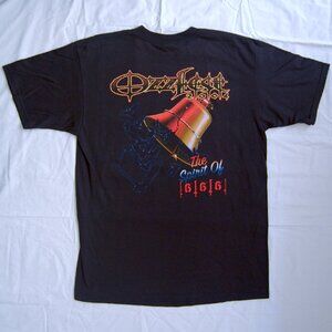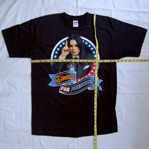 Ozzy for President?! Whot you onabout mate? This rare offering from 2004 is worth a chuckle at the very least and maybe the start of a movement. Who knows these days! Front art shows Ozzy in campaign speech mode. The back is self-explanatory with Bats In The Belfry coming at you. Get this one while it lasts! Size Large measuring 31" Tall x 21.5" Wide. Tee is in perfect condition.