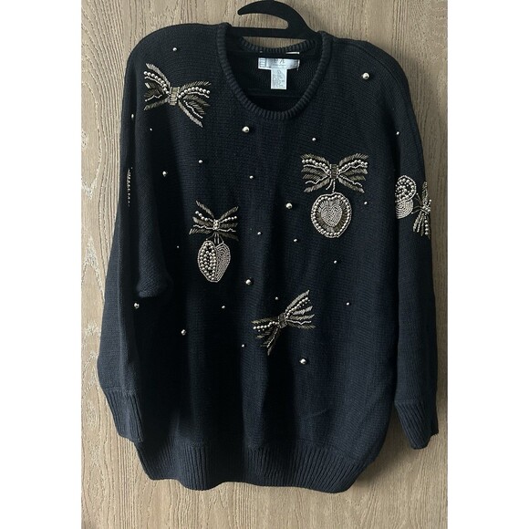 The VTG Retro Womens L Holiday Sweater with Gold Pearl and Bow Embellishments is a vintage-inspired pullover sweater perfect for the winter and fall seasons. The sweater features long sleeves, a knit fabric made from ramie and cotton, and embellishments of gold pearls and bows. Ideal for casual occasions, this size L sweater in a festive gold color brings a touch of retro charm to any outfit. With a holiday theme and a classic pullover style, it is a timeless piece from the P.A. International brand that can be styled in various ways for a chic and cozy look.
