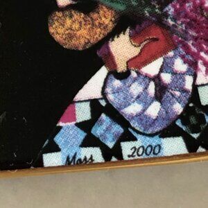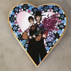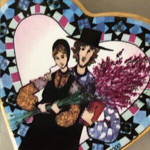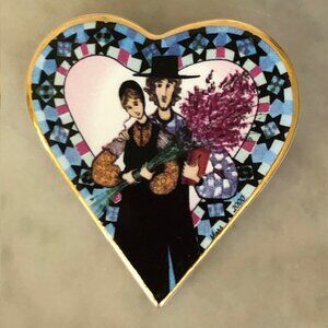 Society Membership of the Virginia artist Pat Buckley Moss presented one of these beautiful porcelain pins each year to their members. This one is from the year 2000 and is called "Story of Love". Shape of a heart showing an Amish couple holding flowers. There is a gold tone pin on the back with a place for a chain if you prefer to wear this as a necklace.