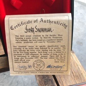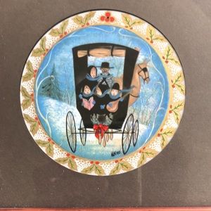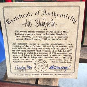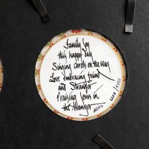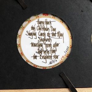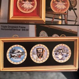 Beautiful set of three P Buckley Moss Ornaments set in a custom 15.5”x7.5” wooden frame with open back to showcase the quotes and series number of each ornament