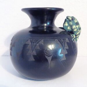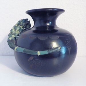 P Mateos Handmade Vintage Pottery Black Vase with Green Iguana