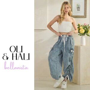 P0815 OLI & HALI Washed Drawstring Cinched Wide Leg Pants Jeans
