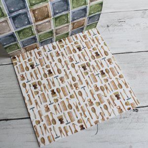 This package of scrapbook cardstock is heavy quality with an earthy theme with flowers, gardening, wood, globe, soaps, lemons, fruit, vintage shaving, farmhouse kitchen tools, etc. Colors include earthtone green, brown, blue, white, beige, brown, etc. It is brand new with tags.