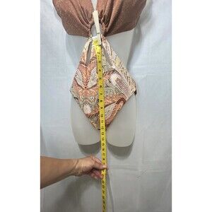 The P2F Women's Medium Copper Bathing One Piece Cut Out Swim Suit is a stylish and colorful swimwear option perfect for the beach. The suit features a paisley pattern with a center ring and bow accents, adding a unique touch to the design. Made from a blend of polyester, spandex, and nylon, this comfortable one-piece suit has a glitter copper bikini top and paisley bikini bottom style, making it a trendy choice for women looking to stand out at the pool or by the water. With the theme of beach and colorful, this swimsuit is sure to make a statement.