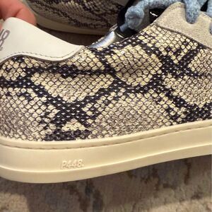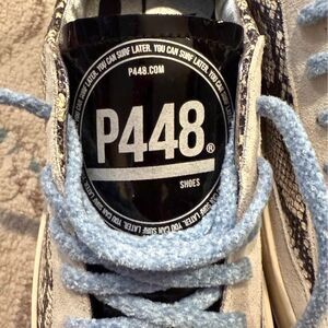 Gorgeous P448 John Silver Python low-top sneakers with snakeskin print embossed leather and soft suede. Powder blue chenille plush laces add a luxe touch. Women’s size 9 (EU 40). Like new condition- worn once. Retail for $298.