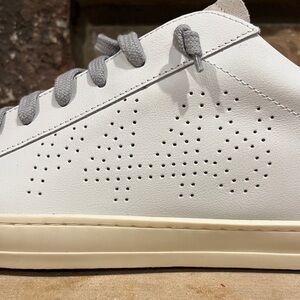 Step up your footwear game with these stylish P448 John sneakers. Featuring a sleek white design with black accents, these shoes offer both comfort and style for any occasion. Leather upper with suede tongue. Soft terry lining. Black rubber sole. Unworn return new without tags. Most items ship next business day.