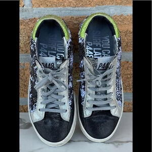 Factory distress Chrome black/white sequin details which give like a snake print vibe Crushed silver tongue Cool Grey laces Chrome green back Ivory off white bottoms no box retail $298 runs a little big could fit up to 6.5