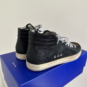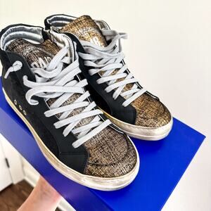 Details: P448 Metallic Skate High Top Lace Up Sneakers - Size: 37- Color: Black/Gold- Material: - Features: High top, lace up closure, rubber outsole, round toe, metallic, lined, logo, comfort, breathable, casual.