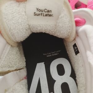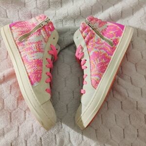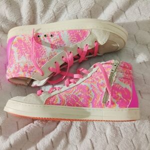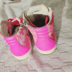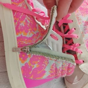 orange and neon Pink on Canvas and suede mid top sneaker with zippers on the side for easy on and off.