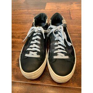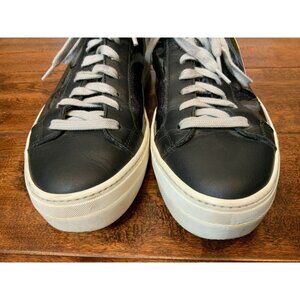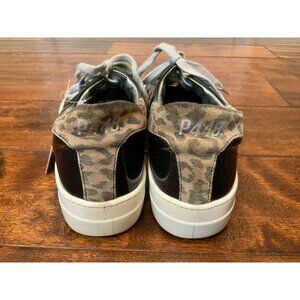 These P448 sneakers feature a purple sparkle patent leather upper with a stylish leopard pattern. They have a round toe shape, lace-up closure, and a flat heel. The shoes are comfortable with a standard shoe width and a leather insole.