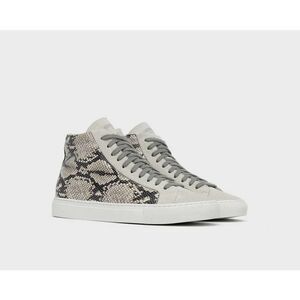 The Star2.0 sneaker in "Silver Python" by P448: This super-cool, made in Italy, high-top sneaker is amazingly comfortable. Featuring a python skin printed leather and light grey suede, inside zipper and rubber sole. Can be worn laced or unlaced.