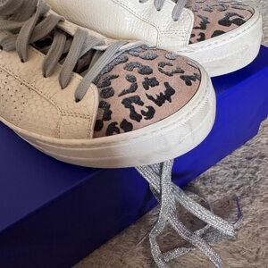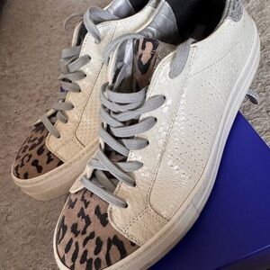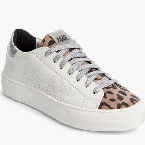 Stylish P448 sneakers. White leather with silver details. Perfect for casual wear. Comes with both gray and silver laces. Used - good condition