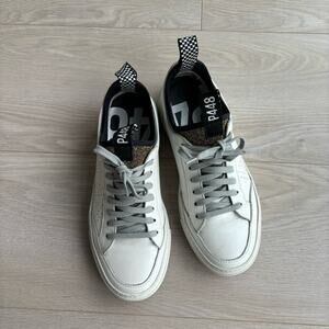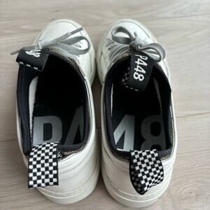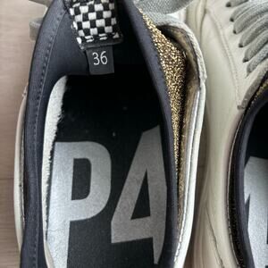 P448 white leather soho sock sneakers with gold metallic detail. The shoes are a women’s EU size 36/ US 6