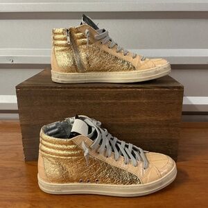 Stylish P448 womens high top sneakers featuring gold metallic leather sides and beige croc embossed toe for a luxe streetwear look. Crafted in Italy with silver gray laces and side zippers for easy wear. Perfect mix of modern glam and casual comfort. US size 8.5. Pre-owned. Aesthetics: luxury streetwear metallic neutral Italian design croc texture #P448 #LuxurySneakers #StreetStyle
