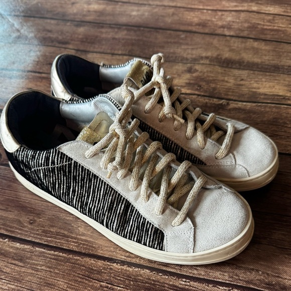 • Colors: Black/white patterned sides with beige suede and metallic gold accents 🖤🤍💛