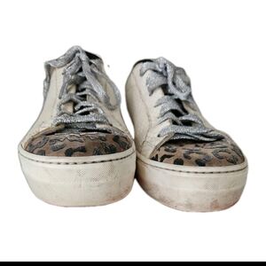 Made for the playful spirit, P448 Thea Low Top Platform sneaker makes a statement. Sitting on top of an exaggerated but super lightweight sole, these platform sneakers give you some added height for instant leg lengthening! Details: * Perforations coyly brand the side of this Italian sneaker styled with contrasting animal motifs and soft, breathable French terry lining. * Lace-up style * Leopard print tongue * Silver metallic laces and accents * Padded collar * Removable cushioned insole * Durable flex sole * White leather upper * Leather and textile lining * Rubber sole * Made in Italy *