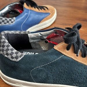 The P448 John sneaker is a pair designed to bring you lightweight comfort and maximum breathability for a fits-like-a-glove feel. Wrapped in blue and tan suede and, complemented by a grey/black checkerboard suede leather heel tab, this unlined pair features black cotton laces and hand-distressed soles to finish off the look. And don’t forget the red patent tongue, silver interior collar and terry lined interior. From luxury, Italian sneaker brand, P448. Gently worn and in great condition. Men’s size 44 EU or 10.5-11 US.