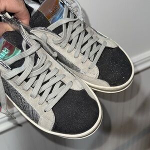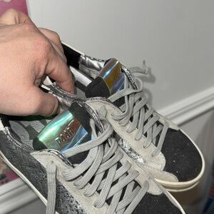 P448 sneakers size 5 Made to look worn silver gray black. Featuring a sleek black and gray design, these shoes offer both comfort and fashion. Perfect for any casual occasion.