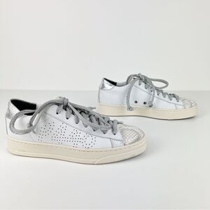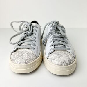 John Low Top Sneakers. Gray/cream snake embossed toe & flap. Metallic silver & gray lace up. Perforated logo sides. Crinkled silver metallic heel. Calfskin leather upper. Removable cushion insole. 1" cream platform rubber sole.