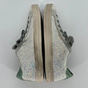 • Classic tennis style elevated with rocking iridescent glitter with suede trim detailed with croc embossed pattern back lip, over a textured distressed rubber sole. Topped with silver metallic tongue with Logo. Made to look dirty & distressed. 1" platform. Color: white, silver, & green. 60% Polyester, 35% Calf Leather, 5% Goat Suede. Made in Italy.