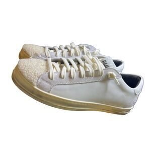 The P448 John M features a white leather upper and toe, beige teddy fabric with sparkling details, and silver leather trim that makes this sneaker stand out.