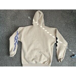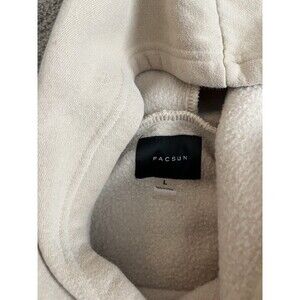 This is a vintage PacSun hoodie in size L for unisex adults. The hoodie is a pullover style with long sleeves and a beige color. Made from a cotton blend fabric, it features a large front pocket and has a "Focus On The Present" design. The item is clean with no stains.