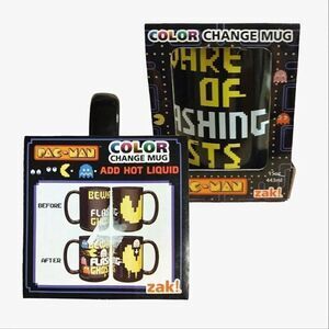 Black shiny ceramic mug, with a yellow Pac- Man print. Changes colors, once hot water (liquid) is poured in- Pac Man's ghosts appear (in multi colors), with "Beware Of Flashing Ghosts". Side handle. Black inside.