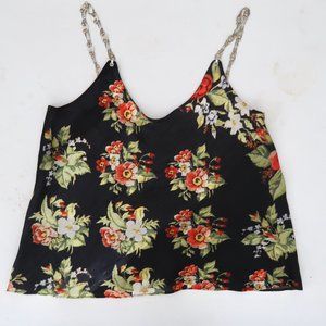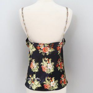 Paco Rabanne floral print charmeuse camisole. Midnight navy blue ground. Chain shoulder straps. 100% polyester. Very good condition, no signs of wear. Original retail was $715. Size F 38 equals US 6. Garment measurements-- bust: 38" front length from top of strap measured straight down: 22 1/2"