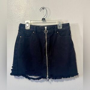 Adorable PACSUN branded denim mini skirt in all black color, full front silver zipper detail/closure with circle pull tag, distressed detail on hem line, above knee length, frayed/fringe hem, belt loops, front and back pockets, minimal stretch.