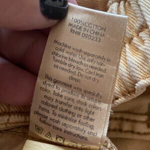 Elastic waist with snap and zipper front closure Cargo pockets on side not real Front pockets and belt loops Melanie