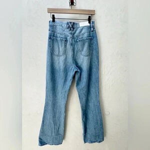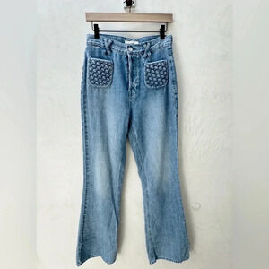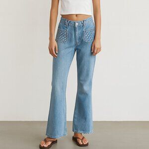 These Madewell jeans fuse retro flair with modern denim craftsmanship. Cut in a flattering high-rise bootcut silhouette, they feature quilted front patch pockets that nod to 70s design with playful texture. Washed in a light vintage blue with soft fading for that worn-in feel. Tagged size 27.