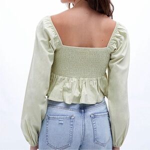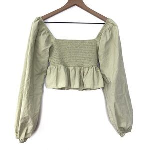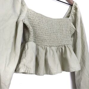 PACSUN LA HEARTS Smocked Babydoll Peplum Ruffle Blouse Crop Top. Square neckline. Smocked bodice. Ruffle peplum hem. Long balloon sleeves. Elastic cuffs.100% Cotton. Hand Wash.