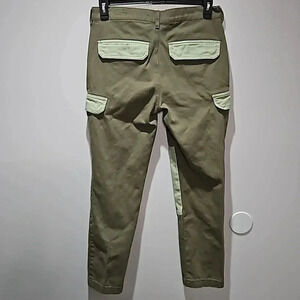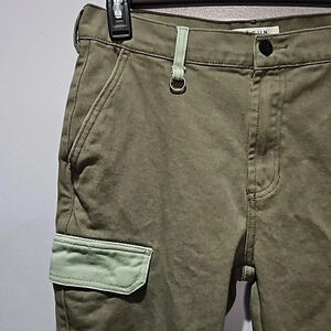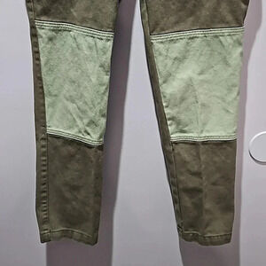 army green colored carpenter pants snap buttons over back and thigh pockets 2 front pockets denim feeling material straight, relaxed fit