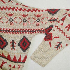 Artery designed Aztec cardigan from PacSun and Roxy. Native-inspired boho patterning with eye-catching red, cream, and black motif. Wonderful for chilly afternoons at home, for huddling around a fireplace, or throwing on top of an outfit for added coziness.
