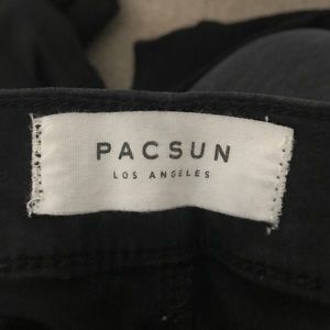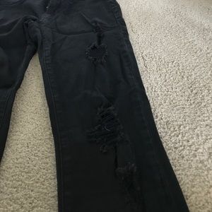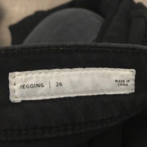 black, high rise jegging with small distressing throughout the leg. skinny fit. only worn once. very stretchy.