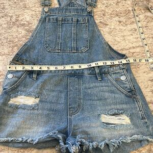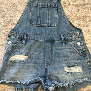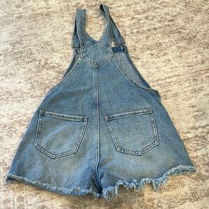 Trendy light blue denim overalls. Features adjustable straps and a front pocket.