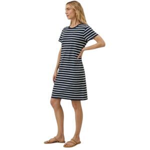 Effortless and comfortable, this PACT Softspun Tee Dress is crafted from soft, breathable organic cotton. The navy-and-white striped design gives a timeless nautical look — perfect for casual days, travel, or layering under a denim jacket.